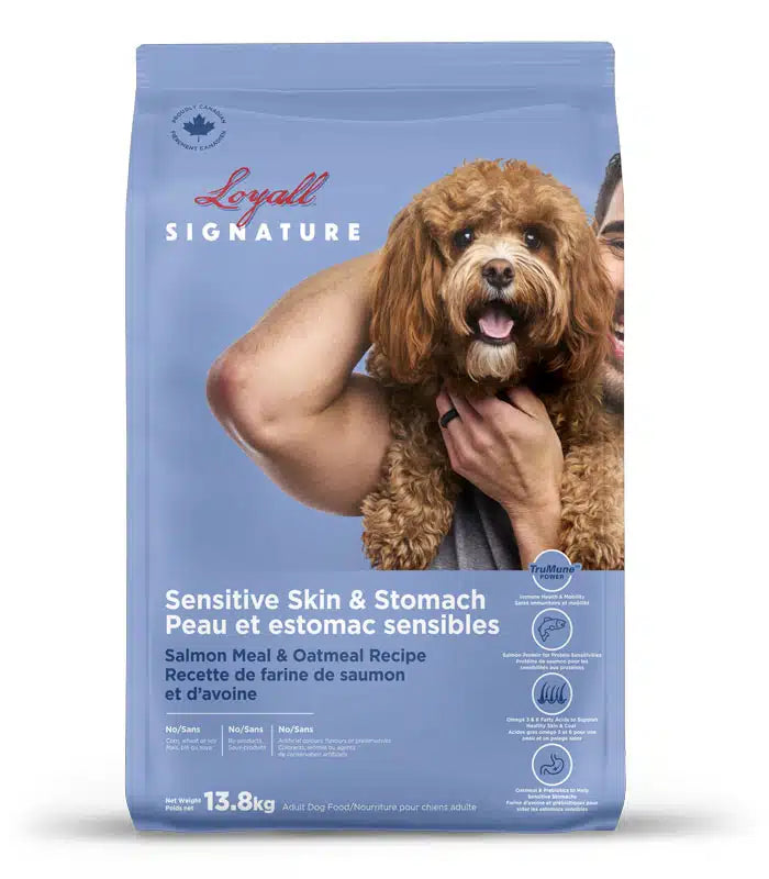 As a pet parent, you want to give your dog the gift of great nutrition and quality of life. Loyall® Signature Sensitive Skin & Stomach Salmon Recipe offers a specially crafted formula that helps to nourish your dog’s sensitive stomach and skin by featuring salmon protein as the #1 ingredient. Loyall® Signature Sensitive Skin & Stomach Salmon Recipe is a wholesome option that’s ideal for dogs with protein sensitivities. It’s always free of corn, wheat, soy, and by-products. With guaranteed levels of Omega 6 and Omega 3 fatty acids, it supports coat and skin health. Our patented Opti-Cook® process, fruits and vegetables, selected carbohydrate source as oatmeal, and added prebiotics help support digestive health. You can always count on every bag of Loyall® Signature providing Trumune® power to support immune health and mobility.