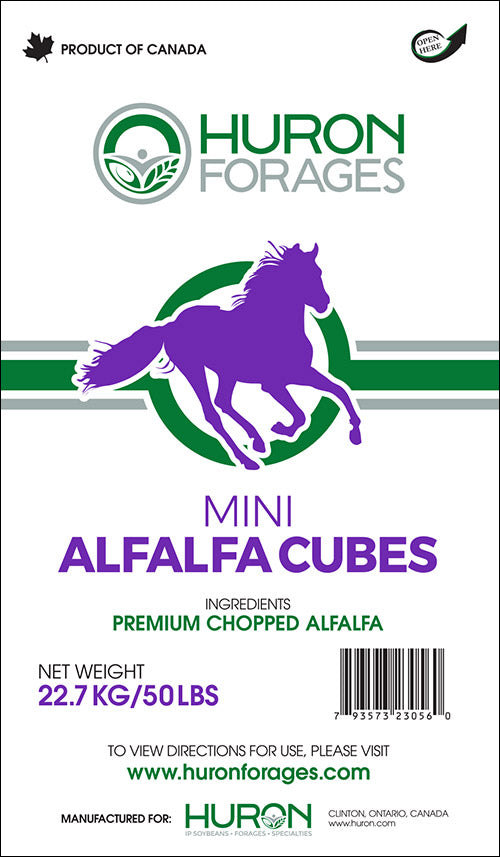 Available in a regular size cube 1 ¼”. These cubes are highly digestible and a much more efficient source of protein, minerals and vitamins than even the best quality hay. No other ingredients are added prior, during or after this process for binder. Easy to store, easy to handle Huron Brand forage cubes deliver the same high quality nutrition & taste all year long.
