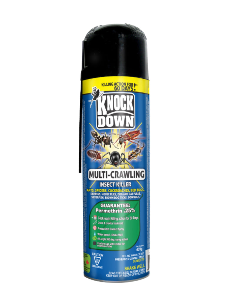 The Knock Down Multi-Crawling Insect Killer is ready to use. Within the specified use location, to enhance effectiveness of this product, apply directly to the crawling insects listed; ants, spiders, cockroaches, bed bugs, earwigs, house flies, dog and cat fleas, silverfish, brown dog ticks, and sowbugs.