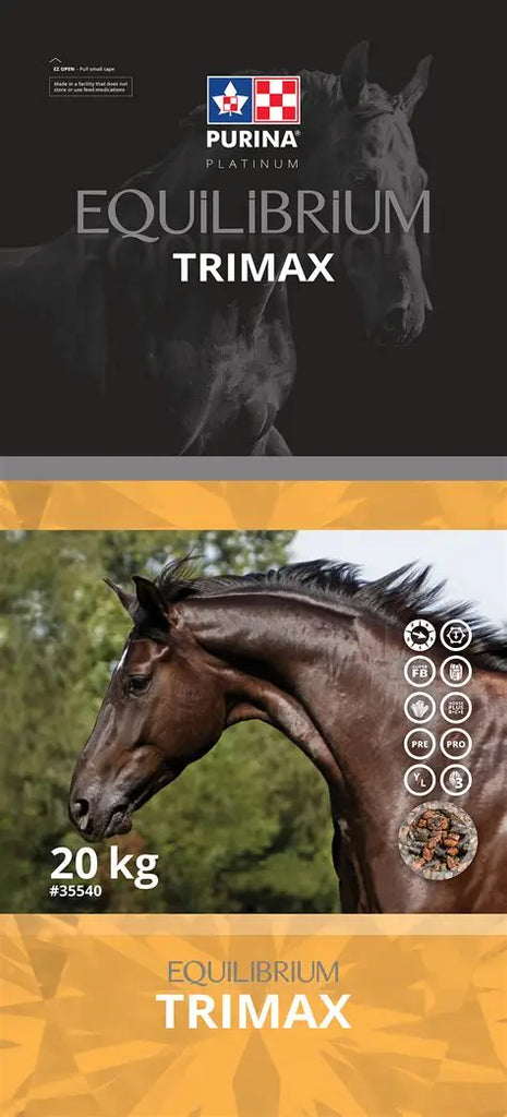 Equilibrium Trimax is a high caloric, low glycemic, multiparticle feed (contains pelleted and extruded components) for equine athletes and hard-keepers. Equilibrium Trimax utilizes the latest research on the nutritional requirements for optimal performance and gut healthwhile minimizing "tying-up". Formulated with proven quality ingredients and manufactured exclusively by Cargill in a specialized drug‑free equine facility.