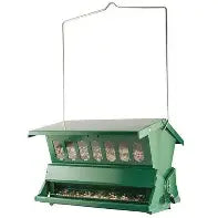 Selectively offer seed to small songbirds with this Heritage Farms Absolute III Squirrel Resistant Weight Sensitive Bird Feeder. The durable, steel body creates a lasting feeder, and its generous capacity helps your feathered friends remain well fed. The center chamber of this unit holds 8 quarts of bird seed, and plastic windows on the front and back make it easy to monitor the levels. A trough beneath these windows creates plenty of feeding spots, while weight sensitive, metal perches allow small songbirds to stand. When a squirrel or other animal places its weight on the perch, a metal shield covers the seed ports, preventing them from dining. Calibrate the sensitivity on these perches to discourage larger birds as well as squirrels. The roof locks in place for an added deterrent, and swings upward for easy refilling. The bold green, powder coated finish perfectly enhances your landscaping, and an included, metal hanger makes placement simple. Attach a mounting plate (not included) to the holes on base of the feeder to pole mount it for a different look. Feed several birds while discouraging squirrels from dining with this Absolute III Squirrel Resistant Weight Sensitive Bird Feeder. Made in the USA.
