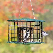 Our Baffled feeder holds two standard suet cakes and is surrounded by sturdy 16 gauge vinyl coated wire mesh with 1-1/2" openings to keep out starlings and squirrels. The top and bottom are powder coated in an attractive green finish.